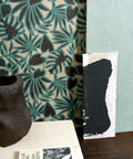 Botanis est un clin d'œil au Monstera et au palmier. La technique de broderie utilisée donne tout son relief au motif tropical où les surpiqûres à l'aspect rugueux et les couleurs contrastées sont mises en avant par un fond en lin apaisant.