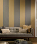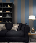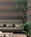 Papier peint avec une structure raffinée de lin et un dessin à rayures en différentes combinaisons de couleurs, allant des subtils camaïeux aux contrastes plus marqués.